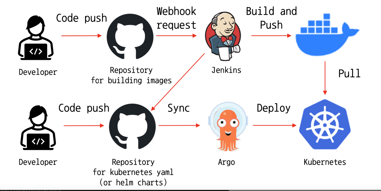 개발자가 작성한 애플리케이션 코드를 소스코드 저장소에 푸시하면, 쿠버네티스 내부에 설치된 젠킨스는 애플리케이션 코드를 빌드하고 레지스트리에 푸시한 후에 쿠버네티스에서 사용 가능한 형태로 배포한다.