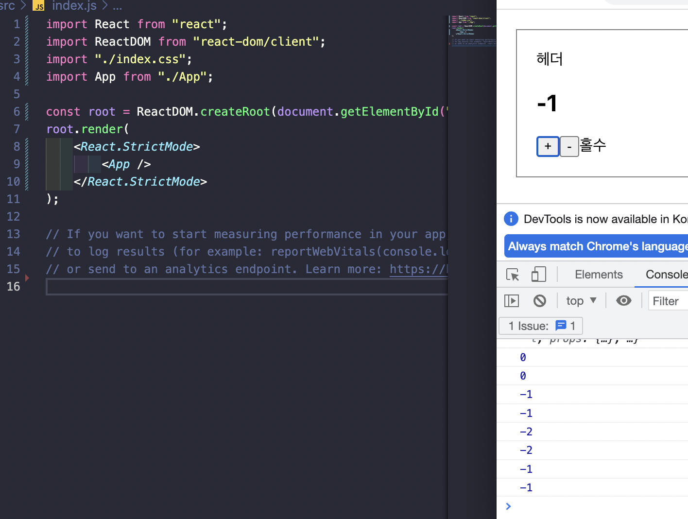 console.log 로 값을 찍어보는데 값이 두번씩 찍히는 증상이 나타났다. 렌더링이 두 번 일어난다는 얘기인데...