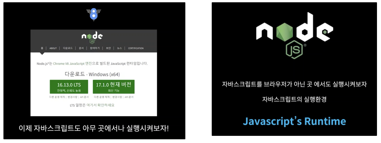 자바스크립트는 브라우저에 내장된 자바스크립트 엔진을 사용해야해서 웹 브라우저에서만 실행될 수 있었다. 그때 마침 크롬이 자바스크립트를 실행할 때 사용하는 js엔진인 V8 은 C++로 개발되어 브라우저 내부가 아니더라도 어디서든 이 엔진을 사용할 수 있었다.