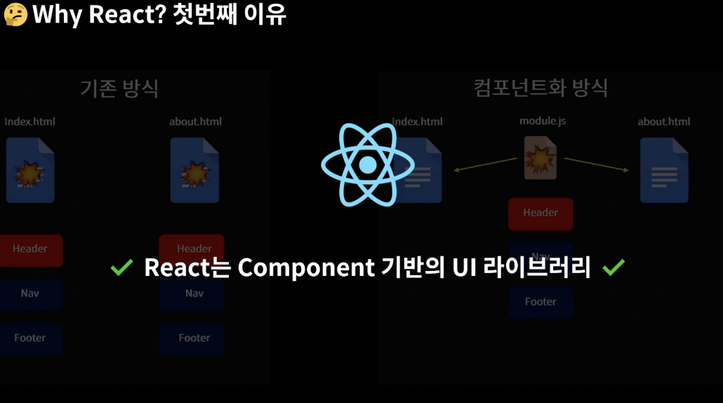 React 는 컴포넌트 기반의 UI 라이브러리 이기 때문에, 모든 html요소를 컴포넌트화해서 재사용 할 수 있다.