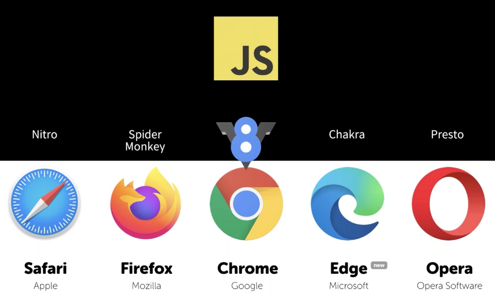 브라우저들은 각각 자기들만의 엔진을 사용한다. 그 중 크롬 브라우저가 가진 V8 엔진이 가장 대표적인 자바스크립트 엔진으로 알려져있다.