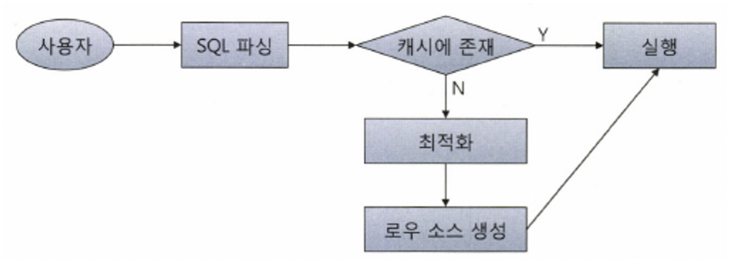 사용자가 SQL문 전달 → DBMS가 SQL을 파싱 후 → 해당 SQL이 라이브러리 캐시에 존재하는지 확인 → 캐시에 존재 ? Y실행 단계 : N최적화 단계