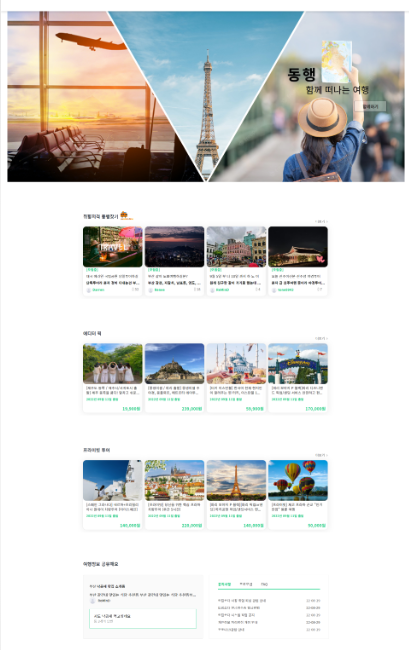 프로젝트 기간동안 제작한 여행 커뮤니티+상점 플랫폼 사이트의 메인페이지.