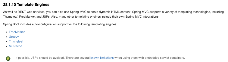 Spring Boot에서는 공식 문서에도 나와 있듯이 JSP를 사용하는 것을 권하지 않고 다른 템플릿 엔진을 추천하고 있다. Spring boot에서 가이드하는 표준은 JAR(JSP, 외장톰켓을 안사용)이니까 JAR를 사용하여 서비스하는 것이 좋다.