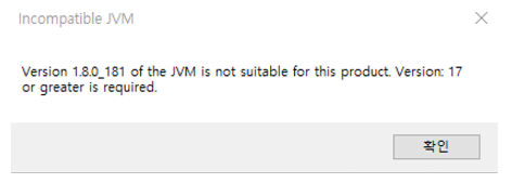 JVM 버전 1.8.0_181은이 제품에 적합하지 않습니다. 버전 : 17 이상이 필요합니다.