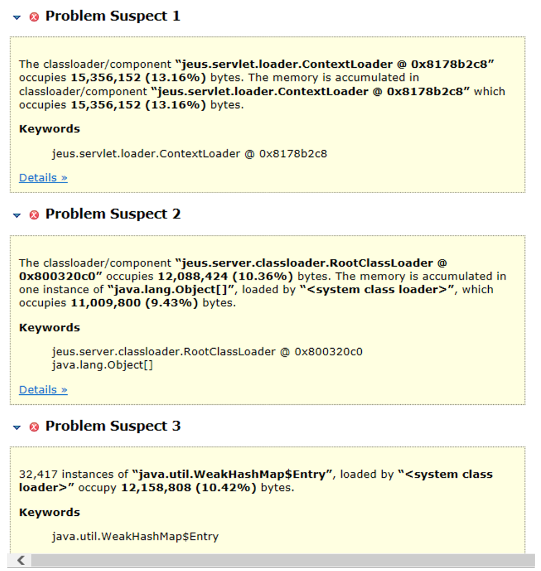 아래 Problem Suspect의 Detail을 클릭하여Biggest Instances, Reference Pattern 등 상세한 내역을 확인 할 수있다.