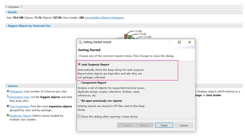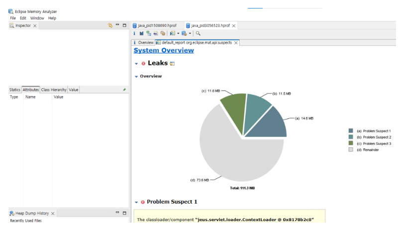 성공적으로 Heap Dump 분석이 끝나면 다음과 같이 원 그래프 및 다양한 기능이 나타난다.