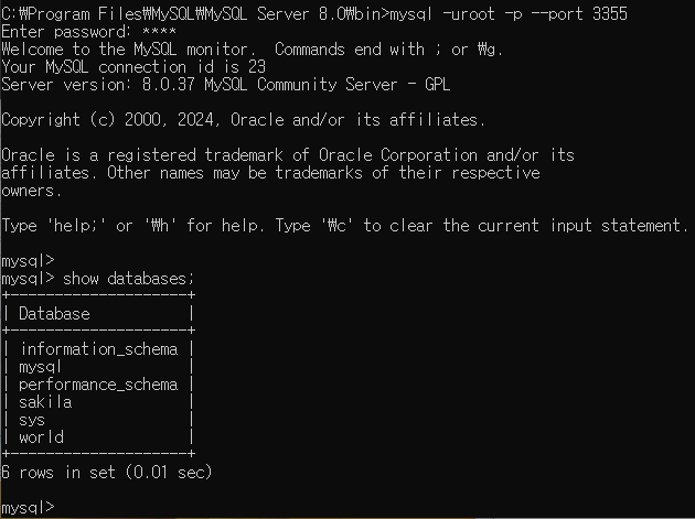 만약 아까 접속포트 변경 없이 기본적인 접속포트 3306으로 설치했다면 mysql -uroot -p 또는 mysql -uroot -p --port 3306 으로 입력하고 엔터를 누릅니다.